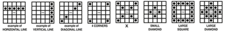 3. If on any of CARDS 5 through 16, you match all numbers in a complete horizontal, vertical or diagonal line; or an X; or four corners on CARDS 5 through 8 and CARDS 13 through 16 only; or a SMALL DIAMOND pattern on CARDS 9 through 12 only; or a LARGE SQUARE pattern on CARDS 9 through 12 only; or a LARGE DIAMOND pattern on CARDS 13 through 16 only, you win the corresponding prize in the prize legend on the side of that CARD.