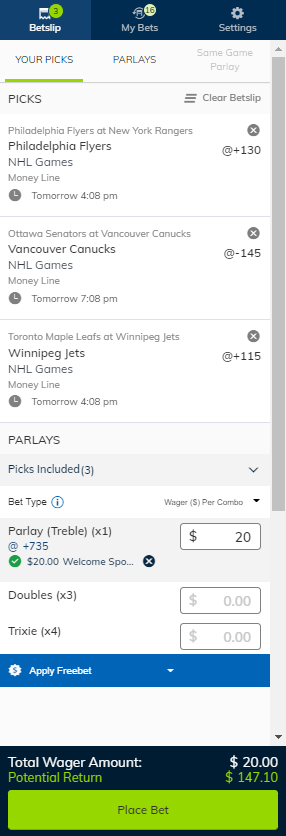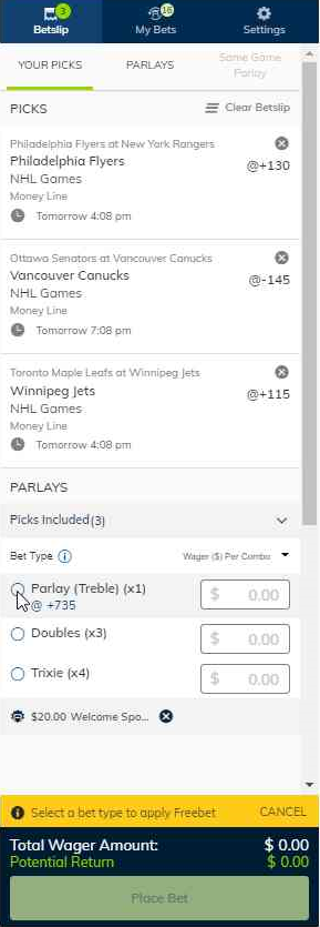 With PlayNow you can now include a pick with a Win/Place bet as part of your parlay. To do this, Simply tick the 'Win/Place' selection box next to the Parlay option you want to bet and the Win/Place option will be added to your bet.