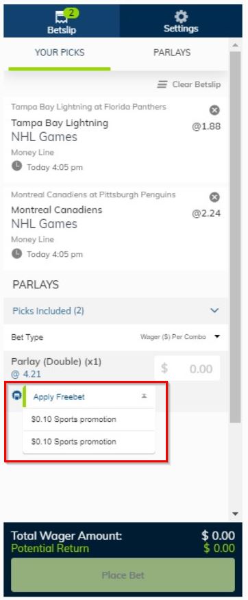 In order to make a parlay bet, select two or more picks to add to your Betslip. Once you have enough combinable picks on your Betslip to create a valid bet, the parlay betting option at the top of the Betslip or below the Singles selections will be displayed. The number of picks you have added to your Betslip will determine the number of parlay options available to bet on.